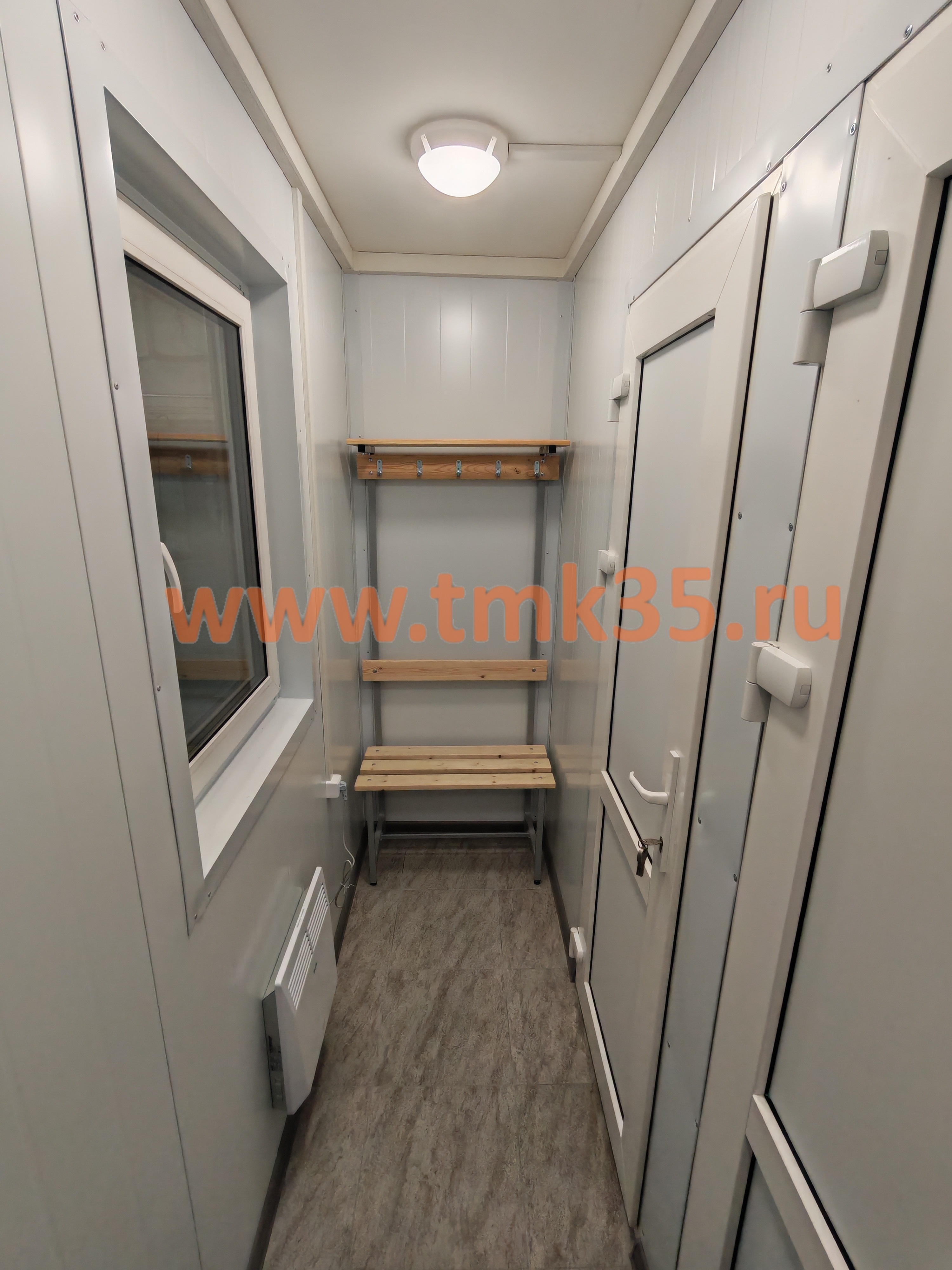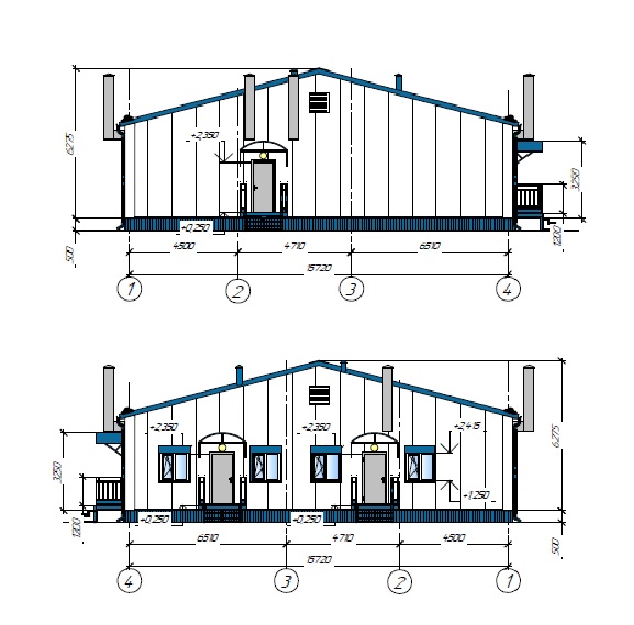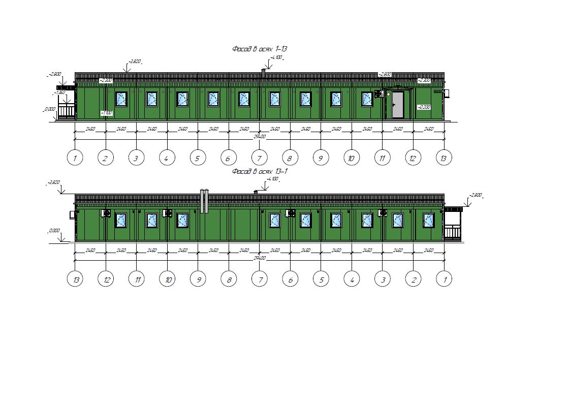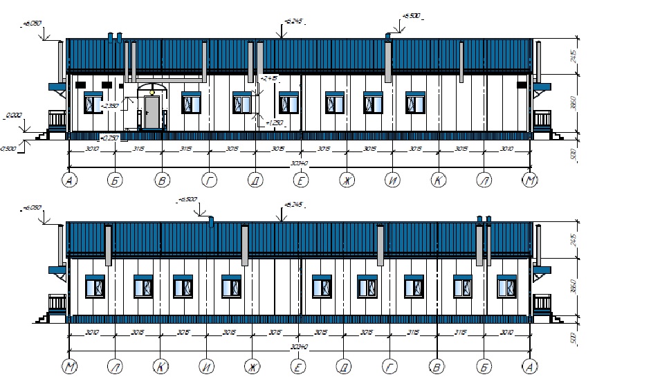 Варианты стен как и выше – панели поэлементной сборки или стеновые сэндвич-панели. Окна и двери по согласованию с заказчиком могут быть уже установлены на производстве или монтируются при сборке блок-модуля.